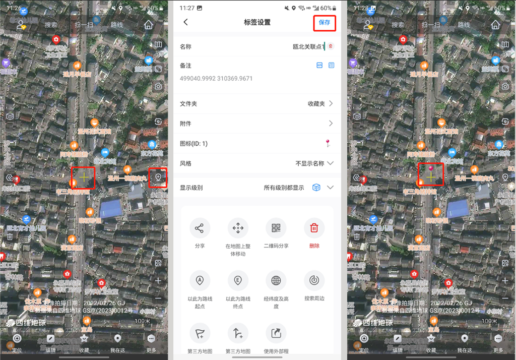 然后在奧維中找到對應(yīng)的點,在該點處創(chuàng)建標(biāo)簽,將該點的CAD坐標(biāo)填寫在備注欄目下面(只需要填寫X和Y,不需要高程),輸入名稱,并點擊【保存】,將標(biāo)簽保存到收藏夾。