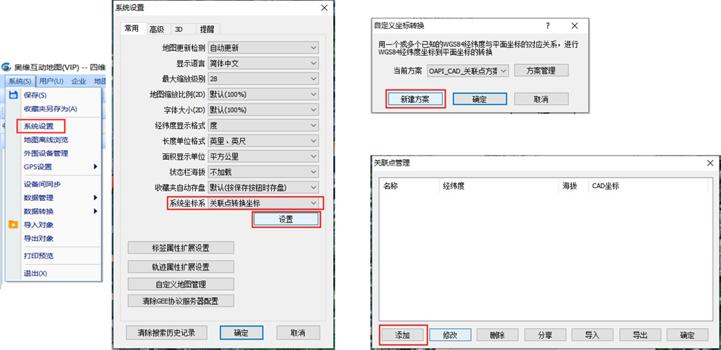 創(chuàng)建完三個關(guān)聯(lián)標(biāo)簽后,點擊[系統(tǒng)]→【系統(tǒng)設(shè)置】,點擊【系統(tǒng)坐標(biāo)系】下拉框,選擇【關(guān)聯(lián)點轉(zhuǎn)換坐標(biāo)】,點擊【設(shè)置】按鈕,進(jìn)入[自定義坐標(biāo)轉(zhuǎn)換]窗口;點擊【新建方案】按鈕,點擊【添加】,進(jìn)入[關(guān)聯(lián)點]窗口。