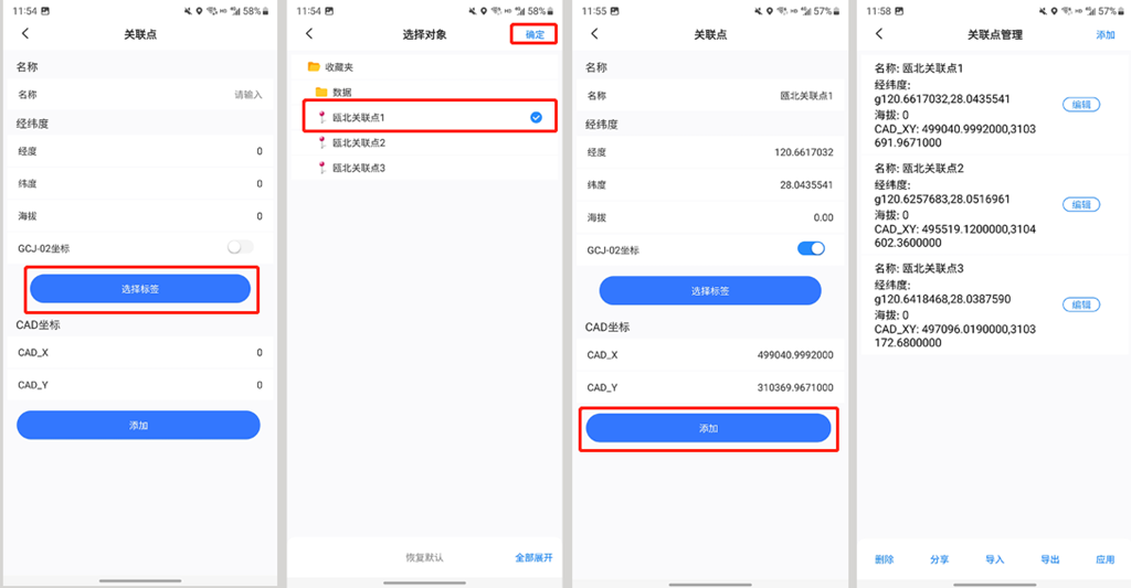 ☆若用戶創(chuàng)建了三個關(guān)聯(lián)點標(biāo)簽,點擊【選擇標(biāo)簽】按鈕,選擇第一個標(biāo)簽,點擊【確定】按鈕,系統(tǒng)會自動填入該點的經(jīng)緯度坐標(biāo)和與之對應(yīng)的平面坐標(biāo),點擊【添加】按鈕,即可添加一個關(guān)聯(lián)點。以此類推,添加三個。