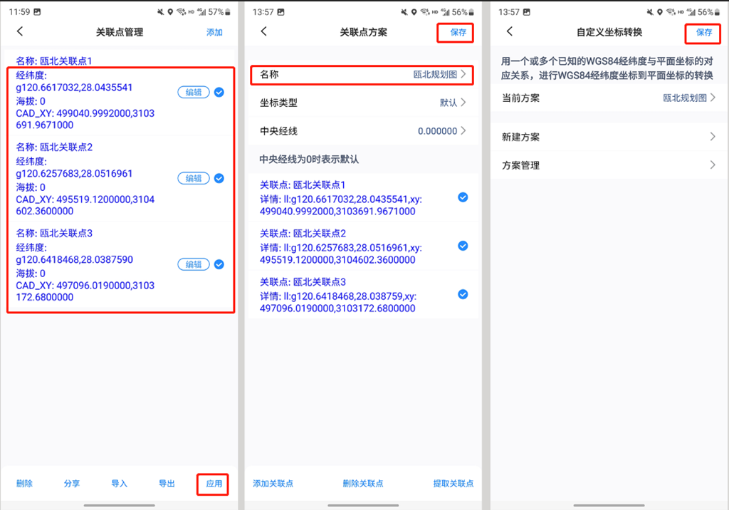添加三個關(guān)聯(lián)點后,勾選,點擊【應(yīng)用】,輸入名稱,坐標(biāo)類型和中央經(jīng)線保持默認(rèn),點擊【保存】;當(dāng)前方案選擇剛創(chuàng)建的方案,點擊【保存】,即可完成坐標(biāo)系的設(shè)置。