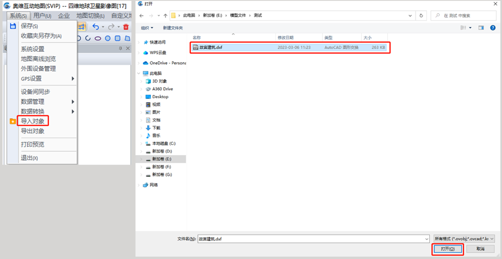 在奧維電腦端,點擊[系統(tǒng)]→【導入對象】,選擇需要導入的CAD文件,點擊【打開】。