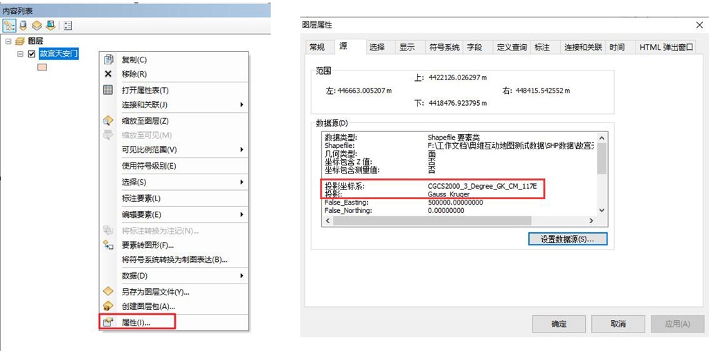 在[內(nèi)容列表]窗口,選中圖層,點擊鼠標【右鍵】,點擊【屬性】,查看坐標系。