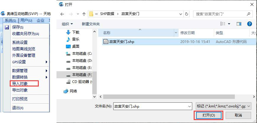 在奧維中,點擊[系統(tǒng)]菜單,點擊【導入對象】按鈕,選擇需要導入的shp文件,點擊【打開】按鈕。