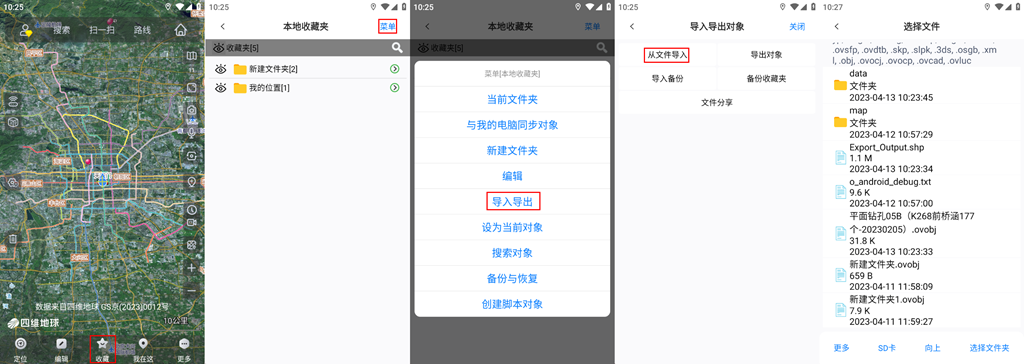 在奧維手機端主界面,點擊【收藏】,點擊【菜單】,點擊【導入導出】,點擊【從文件導入】,進入[選擇文件]頁面。