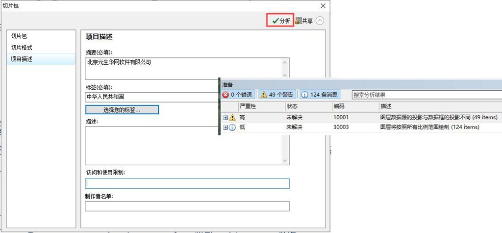 點(diǎn)擊【分析】,系統(tǒng)會(huì)自動(dòng)對(duì)地圖數(shù)據(jù)進(jìn)行分析。如果有錯(cuò)誤提示,一定要處理,否則無法切片,警告可忽略。