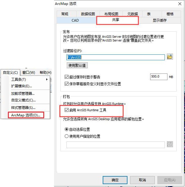 點(diǎn)擊[自定義]菜單,切換到[共享]選項(xiàng)卡,勾選【啟用ArcGIS Runtime工具】,點(diǎn)擊【應(yīng)用】,點(diǎn)擊【確定】。