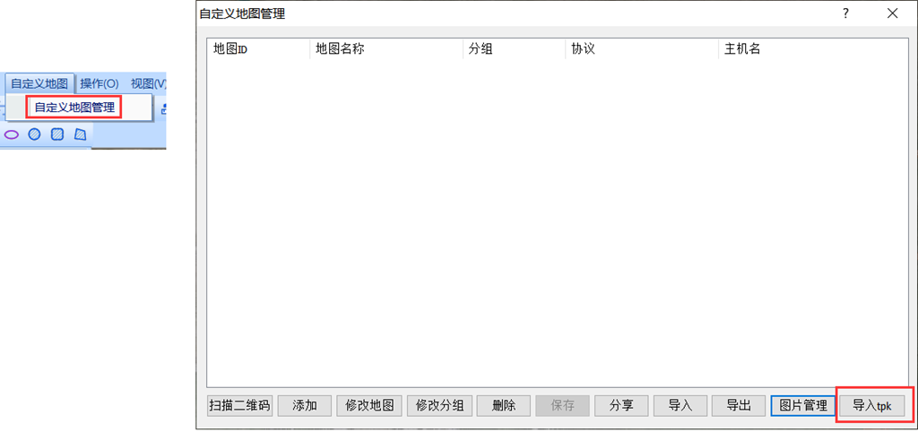 在奧維PC端主界面,點(diǎn)擊[自定義地圖],點(diǎn)擊【自定義地圖管理】,點(diǎn)擊【導(dǎo)入tpk】。