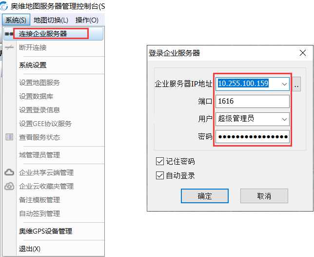 在管理控制臺中,點擊[系統(tǒng)]菜單,點擊【連接企業(yè)服務(wù)器】,輸入IP地址、端口和密碼,勾選【記住密碼】,點擊【確定】,即可。