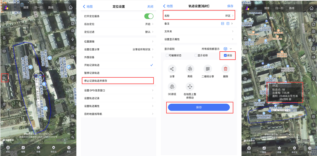 記錄完成后,再次點擊1按鈕,點擊【停止記錄軌跡并保存】,進入[軌跡設(shè)置]頁面,輸入名稱,勾選【閉合】,點擊【保存】,即可將軌跡閉合,并保存到收藏夾中。
