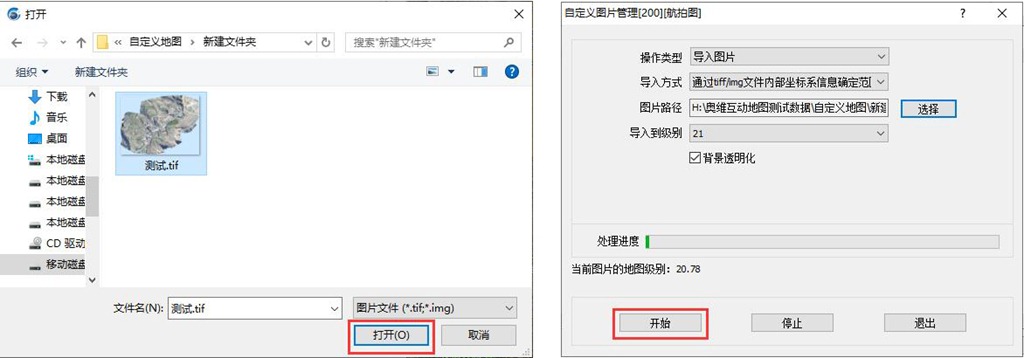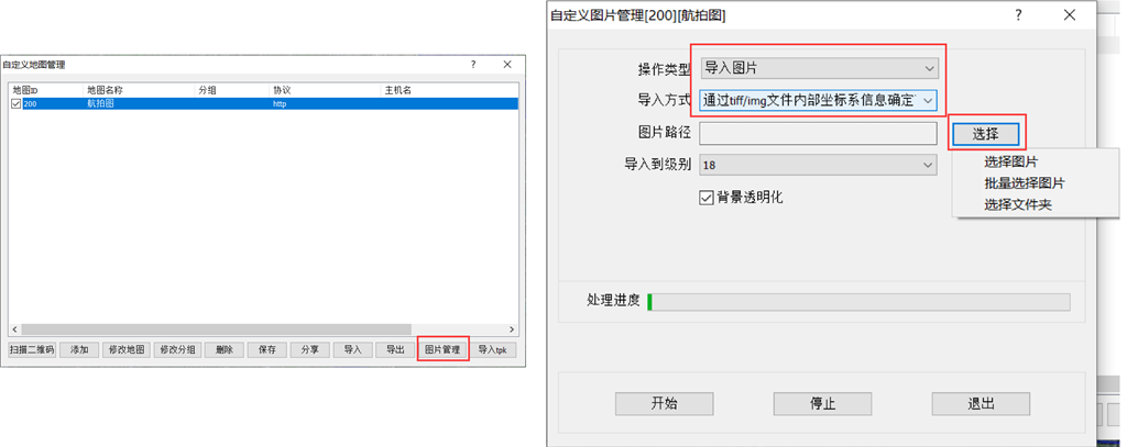 在[自定義地圖管理]窗口,勾選圖層,點(diǎn)擊【圖片管理】;操作類型,設(shè)置為【導(dǎo)入圖片】;導(dǎo)入方式,設(shè)置為【通過(guò)tiff/img文件內(nèi)部坐標(biāo)系信息確定范圍】。