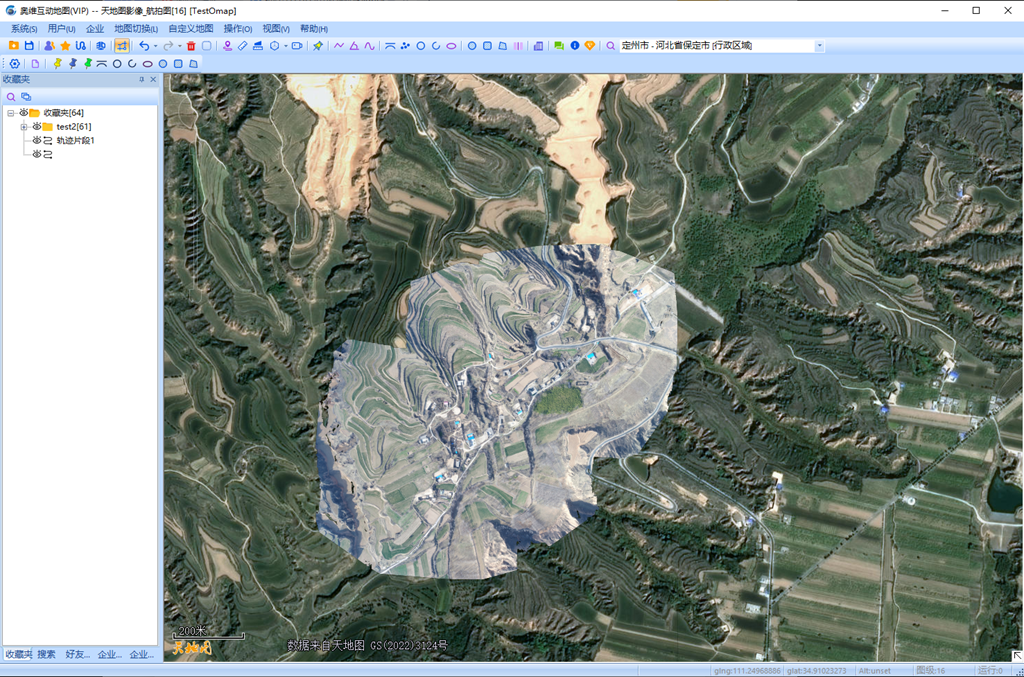 我們將地圖切換到剛設(shè)置疊加層的天地圖影像??梢钥吹剑谔斓貓D影像上,正常疊加了導(dǎo)入的航拍圖。