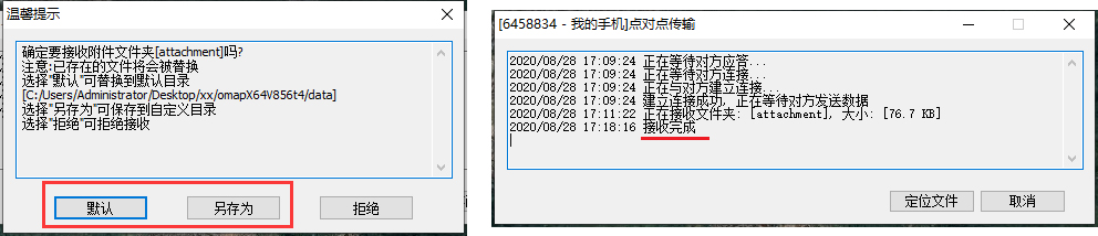 在電腦端(或?qū)?yīng)的好友),提示“確定接收附件附件文件夾[Documents/attachment]嗎?”,選擇【默認(rèn)】,等待提示“接收完成”,即可。