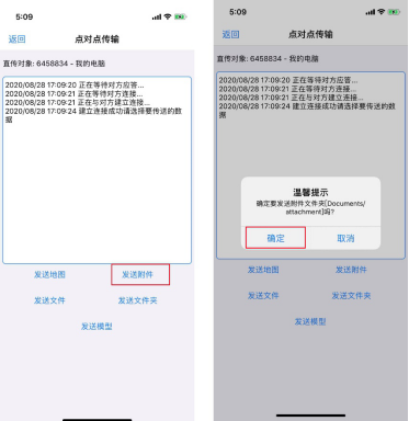 在手機(jī)端[點(diǎn)對(duì)點(diǎn)傳輸]頁(yè)面,點(diǎn)擊【發(fā)送附件】,彈出提示“確定發(fā)送附件文件夾[Documents/attachment]嗎?”,點(diǎn)擊【確定】。