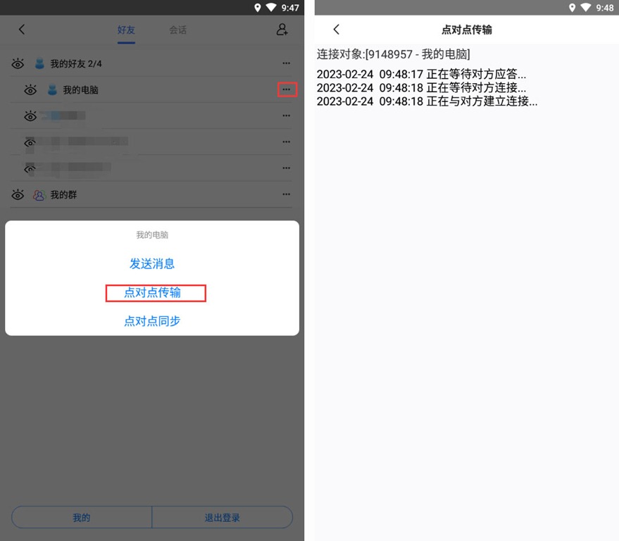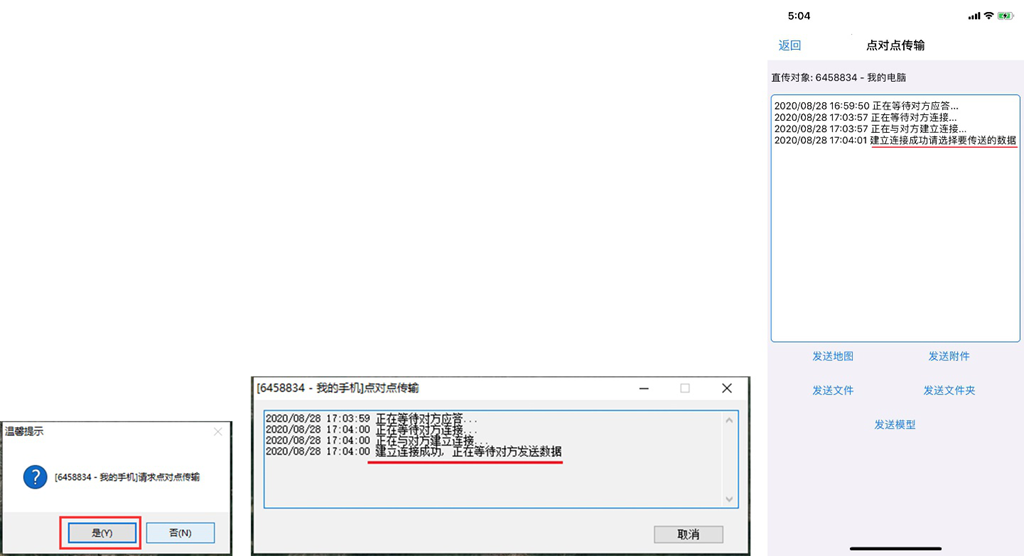 同時(shí),電腦端(或?qū)?yīng)的好友)彈出提示“請(qǐng)求點(diǎn)對(duì)點(diǎn)傳輸”,點(diǎn)擊【是】,等待[點(diǎn)對(duì)點(diǎn)傳輸]界面提示“建立連接成功”。