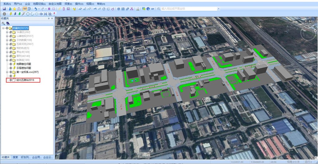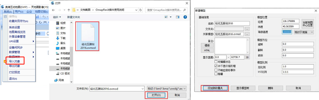 彈出[新建模型]窗口,奧維會(huì)解析該文件。解析完成后,輸入模型位置經(jīng)緯度坐標(biāo),點(diǎn)擊【添加到收藏夾】。