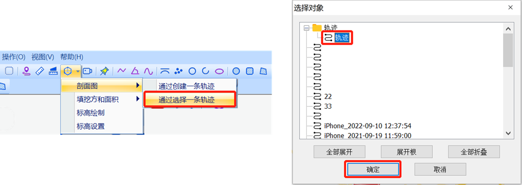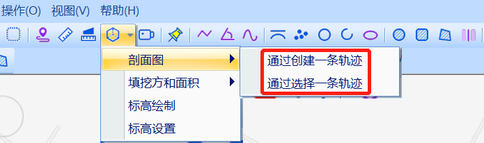 點(diǎn)擊工具欄圖片12按鈕—>【剖面圖】;這里您可以選擇兩種方式:通過創(chuàng)建一條軌跡,通過選擇一條軌跡。