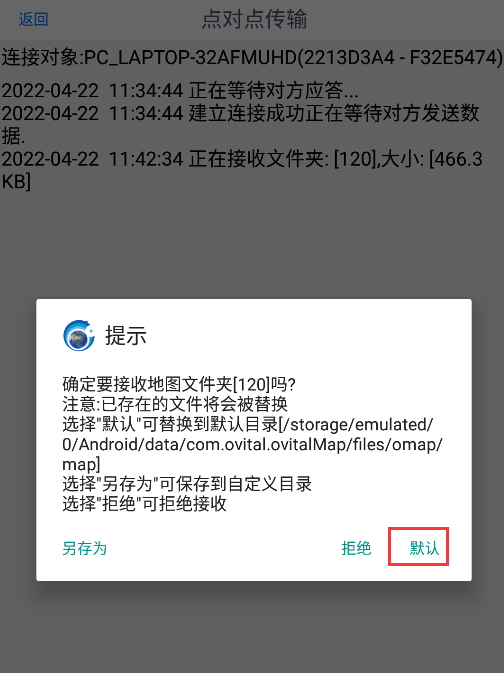 ③在手機端,提示“確定接收地圖文件夾嗎?”,選擇【默認】,等待提示“接收完成”即可。