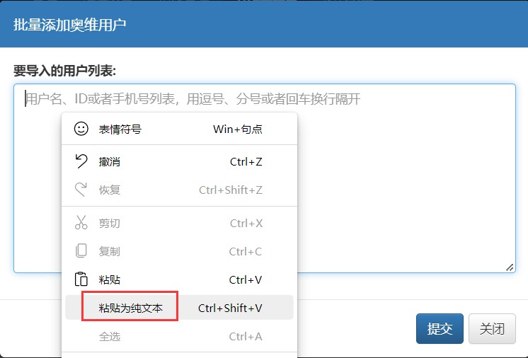 若您購買的 VIP 賬戶都在表格中,可以直接復(fù)制用戶名(或 ID、手機(jī)號),然后在[要導(dǎo)入的用戶列表]中,點(diǎn)擊 鼠標(biāo)右鍵→【粘貼為純文本】。