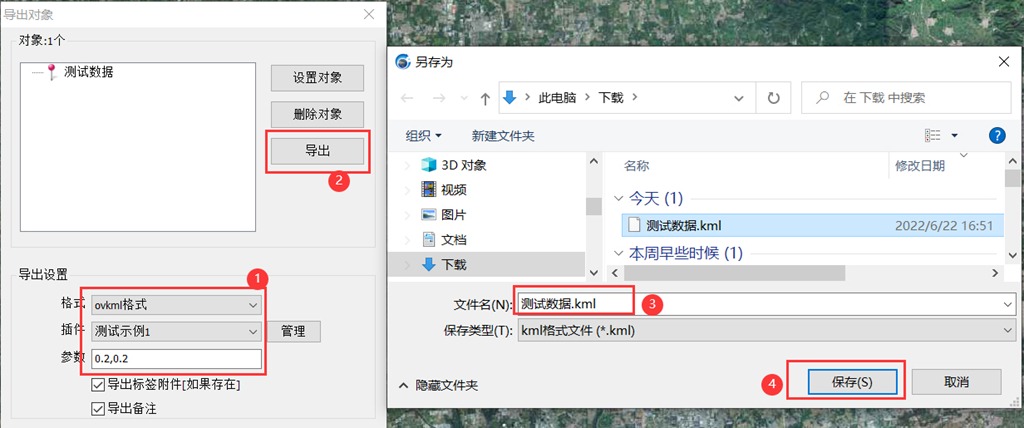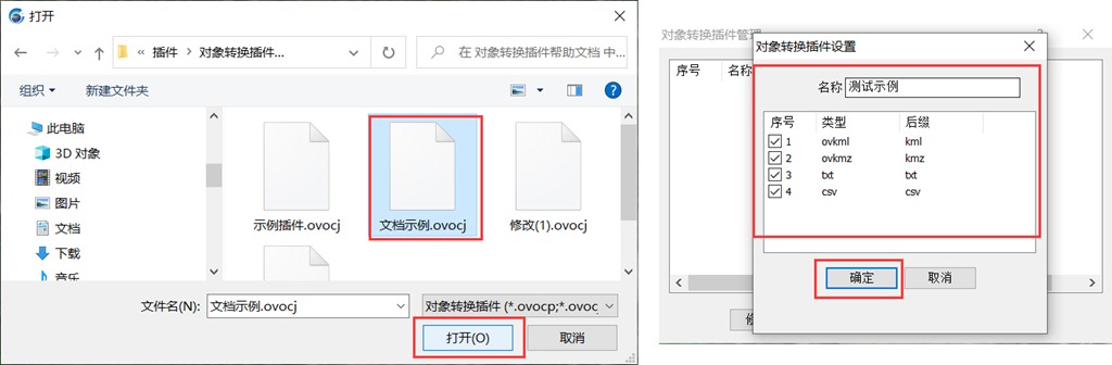 ②格式,設(shè)置為【ovkml格式】,插件處選擇“測試示例”插件或者導(dǎo)入時重設(shè)置的名稱(如對象轉(zhuǎn)換插件未設(shè)置,也可以點(diǎn)擊插件欄右側(cè)的管理進(jìn)行設(shè)置,設(shè)置完的請忽略);
