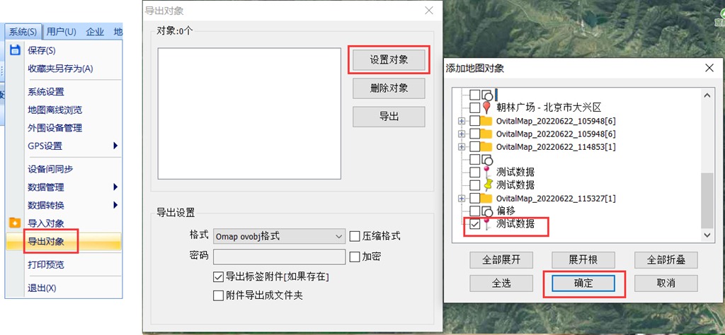 ①點(diǎn)擊[系統(tǒng)]→【導(dǎo)出對象】→【設(shè)置對象】,勾選需要導(dǎo)出的奧維數(shù)據(jù),點(diǎn)擊【確定】;