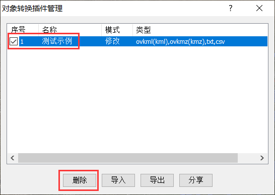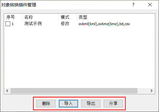 在[對象轉(zhuǎn)換插件管理]窗口,我們可以進(jìn)行刪除、導(dǎo)入、導(dǎo)出、分享等操作。