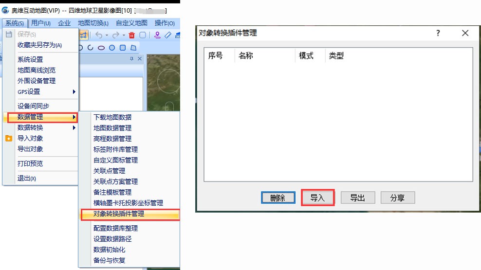 打開奧維互動地圖,點(diǎn)擊【系統(tǒng)】→【數(shù)據(jù)管理】→【對象轉(zhuǎn)換插件管理】,在彈出的[對象轉(zhuǎn)換插件管理]窗口,點(diǎn)擊導(dǎo)入;