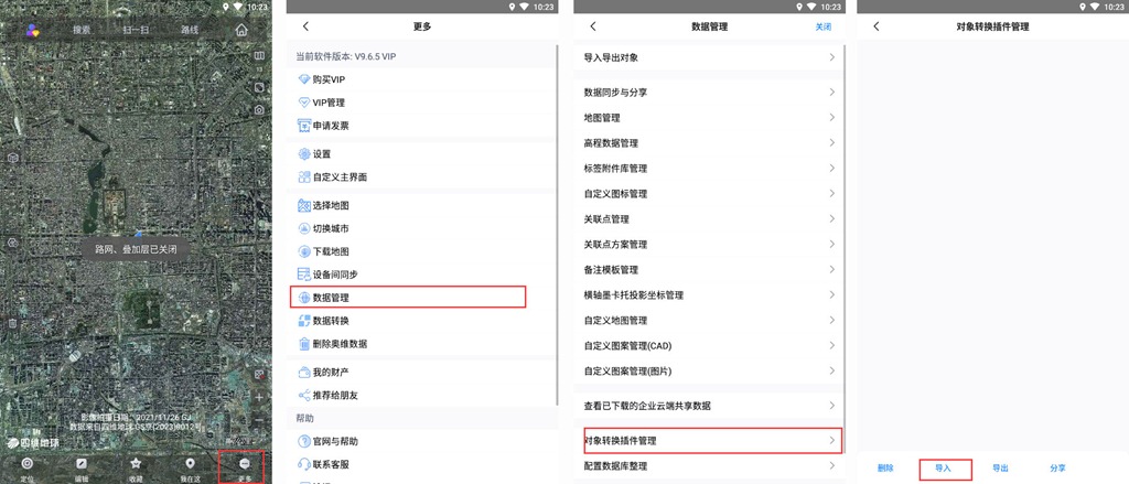 打開奧維互動地圖,點(diǎn)擊【更多】→【數(shù)據(jù)管理】→【對象轉(zhuǎn)換插件管理】,在彈出的[對象轉(zhuǎn)換插件管理]窗口,點(diǎn)擊導(dǎo)入;