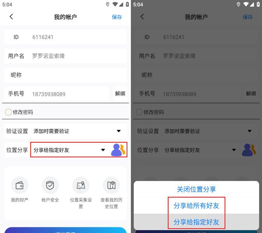 E.在【賬戶設(shè)置】頁面,點擊【位置分享】選擇【分享給所有好友】或者【分享給指定好友】;