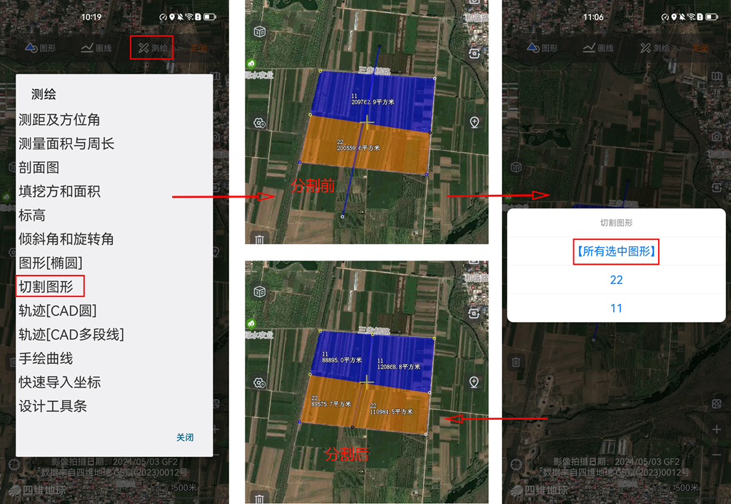 在奧維主界面,點擊【編輯】→【測繪】→【切割圖形】按鈕,繪制一條線段穿過需要切割的圖形,點擊圖片13結(jié)束,彈出[切割圖形]對話框;點擊切割圖形名稱【11】,圖形一分為二。