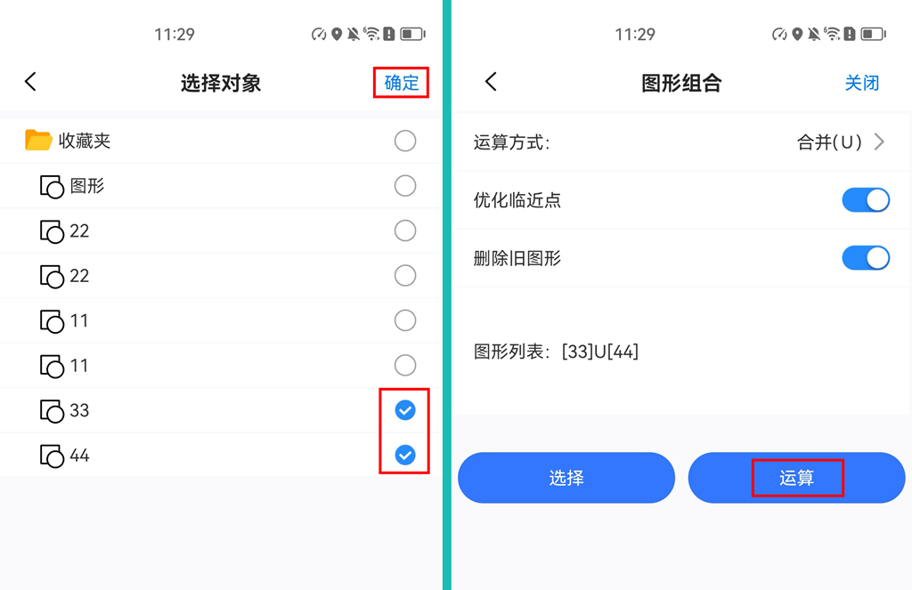 勾選需要合并的圖形,點擊【確定】→【運算】,提示“操作成功”即可。