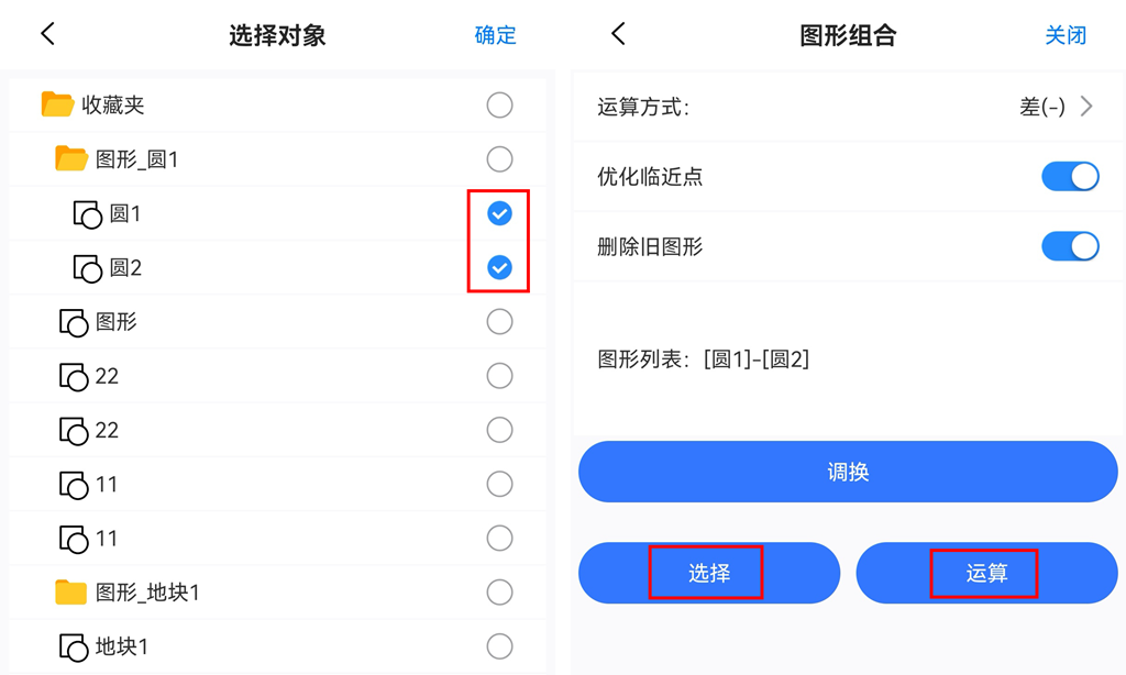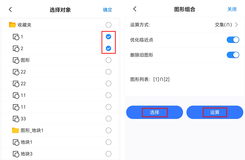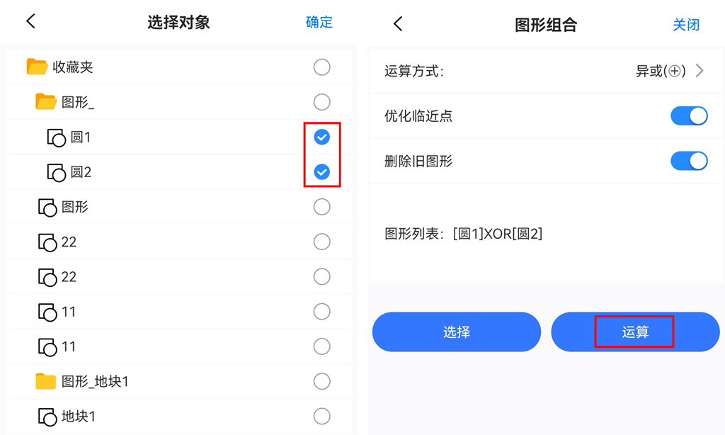 勾選相交的圖形,點擊【確定】→【運算】,提示“操作成功”,即可。