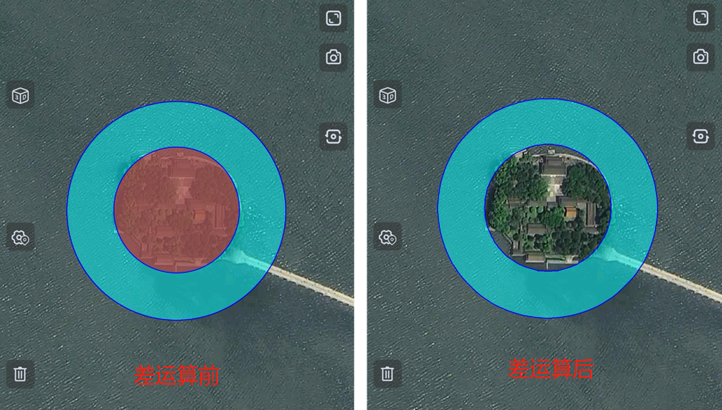 效果1:如下圖所示,兩個圓作“差”運算(即“大圓減小圓”),小圓被刪除,得到“圓環(huán)”
